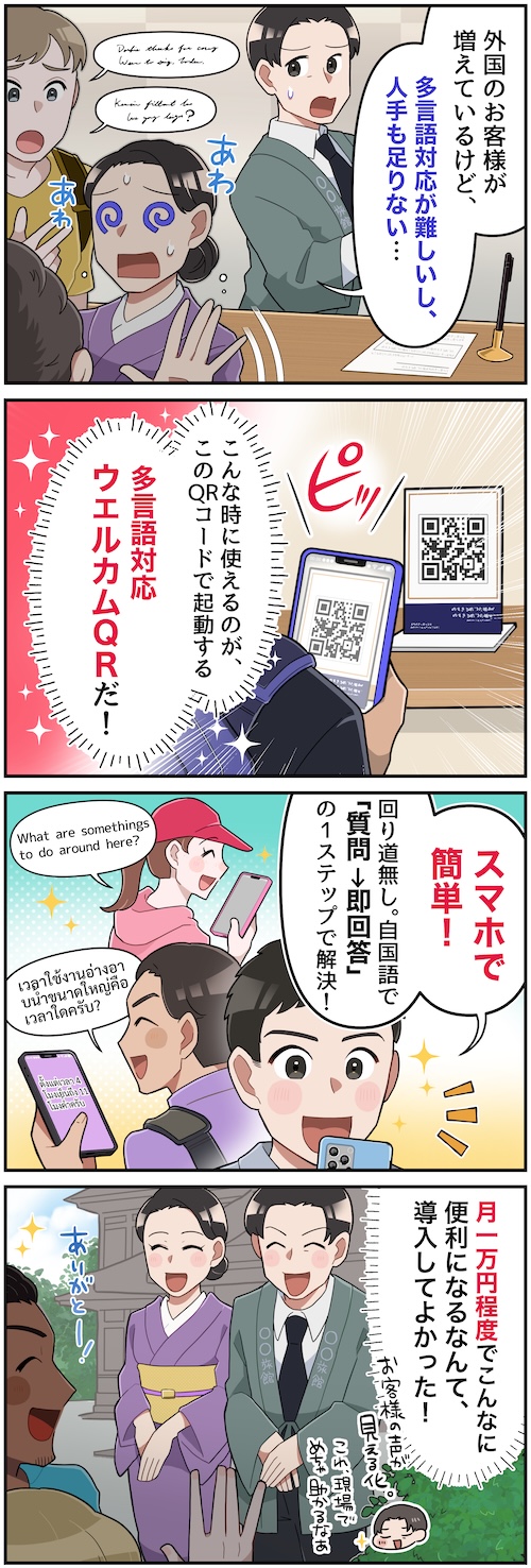「ウエルカムQR」は外国語対応と人手不足で問い合わせが滞留しがちな宿泊現場の課題を、ゲスト到着直後から解消します。QRを読み込むだけで、ゲストは自身のスマホ上で多言語AIから館内・周辺情報を即時取得。フロントの負荷を分散し、スタッフは本来業務に集中。可視化された問い合わせデータを基に改善点が明確になり、満足度と施設評価の継続的な向上を実現します。